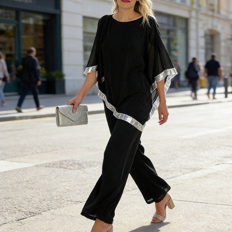 Elegant Sequin Trim Poncho Top & Wide-Leg Pants Set