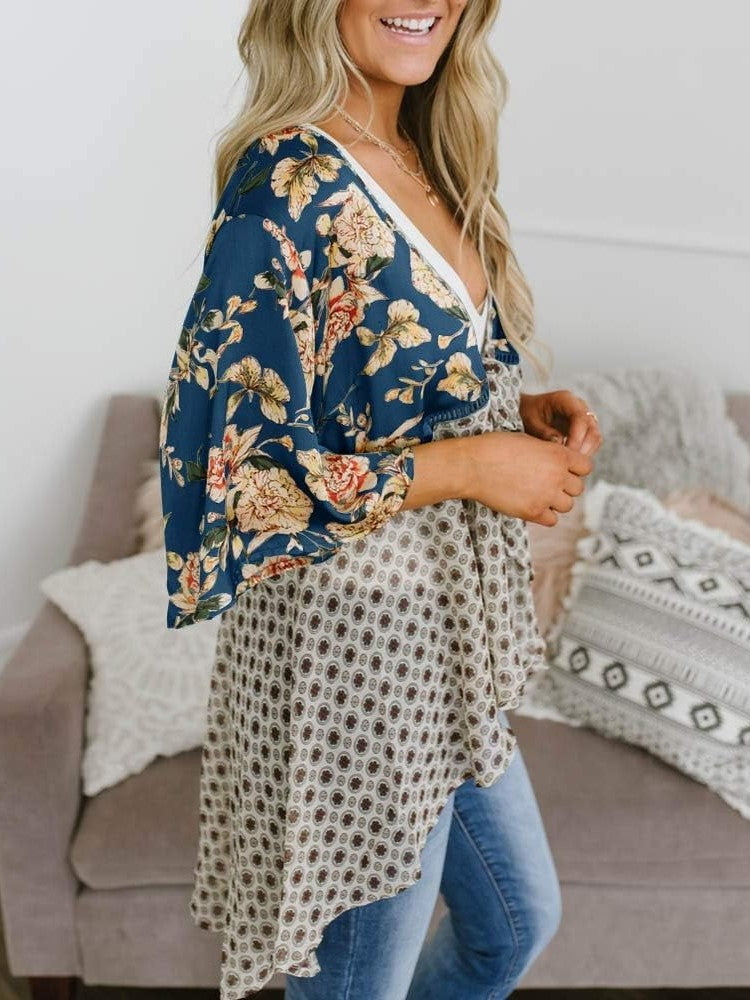 FLORAL PRINT WITH RUFFLE SLEEVES:Half Ruffle Sleeves, Flower Print Pattern, Front Tie Knot, High Low, Asymmetrical Hem, Draped Neckline, Lightweight, Hip Length Tunic, Open Front Patchwork.